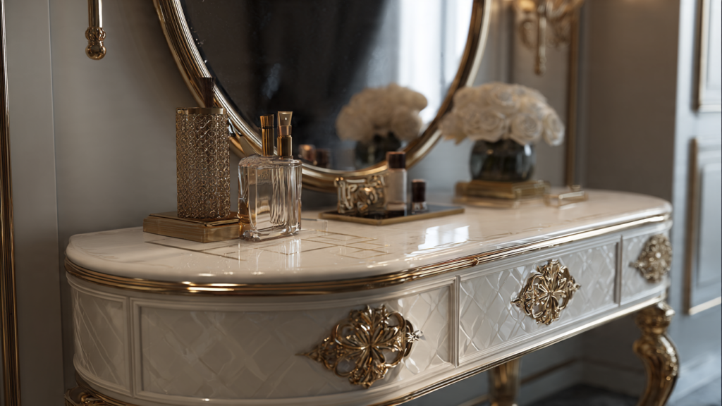 Bàn trang điểm Acrylic bóng gương | MDF phủ Acrylic cao cấp | Bề mặt bóng, sang trọng, hiện đại | Căn hộ cao cấp, spa, showroom |