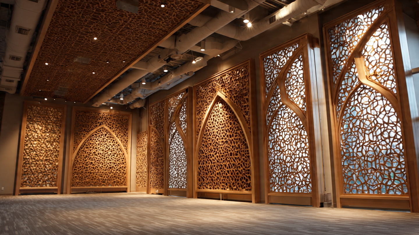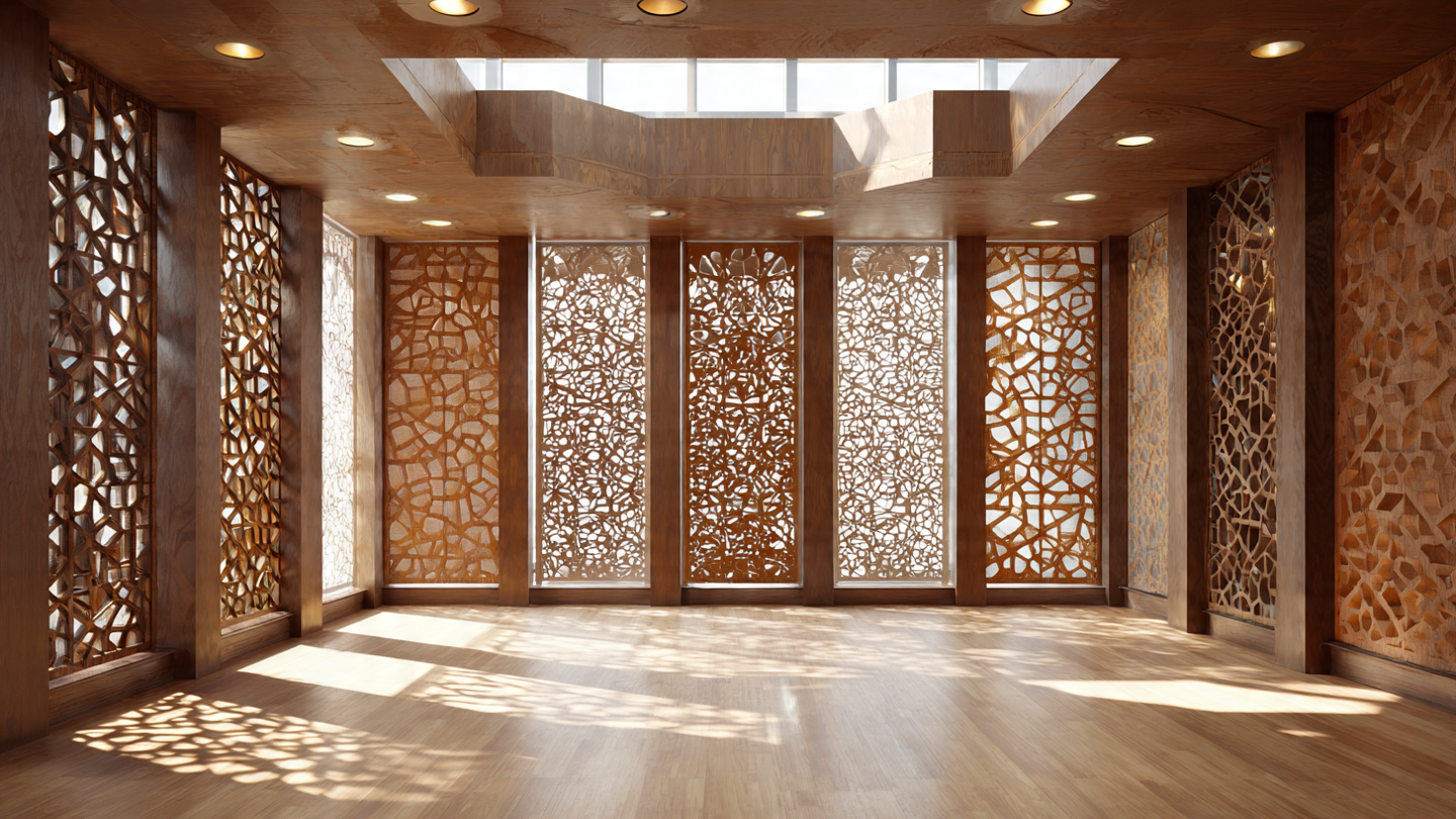 • Gỗ MDF chống ẩm: Cắt CNC hoa văn tinh tế, sơn PU giả gỗ, màu sắc ấm áp.